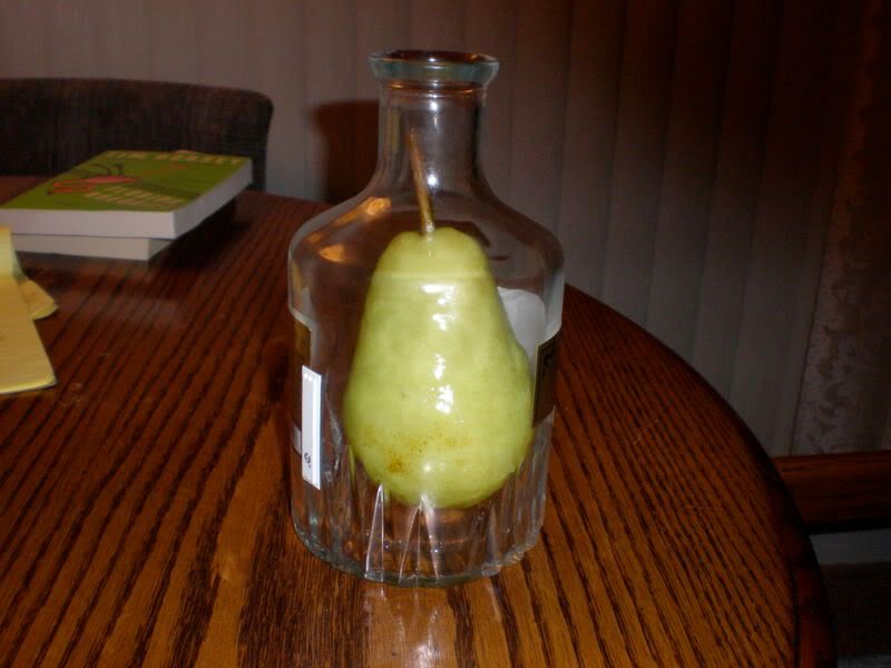 Remove all fluid from bottle. Create a heat source (stove or candle) and flip the bottle upside down. Placing the heat source under the bottle will create a pressure difference and suck the pear out.